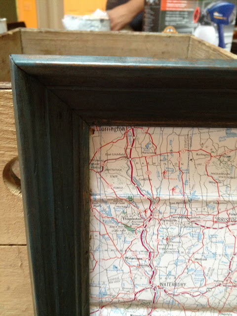 After the paint and wax were dry, I picked maps for each frame from my map pile. To attach the maps to the frames I used my staple gun. I attached each map to the back of the frame making sure everything was straight and lined up.